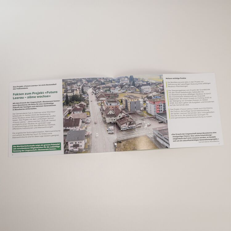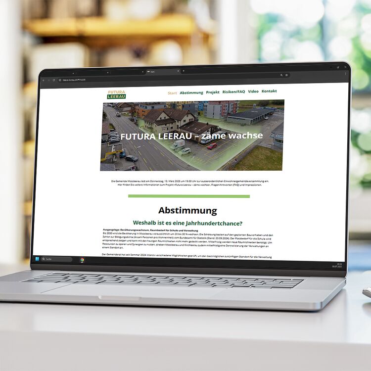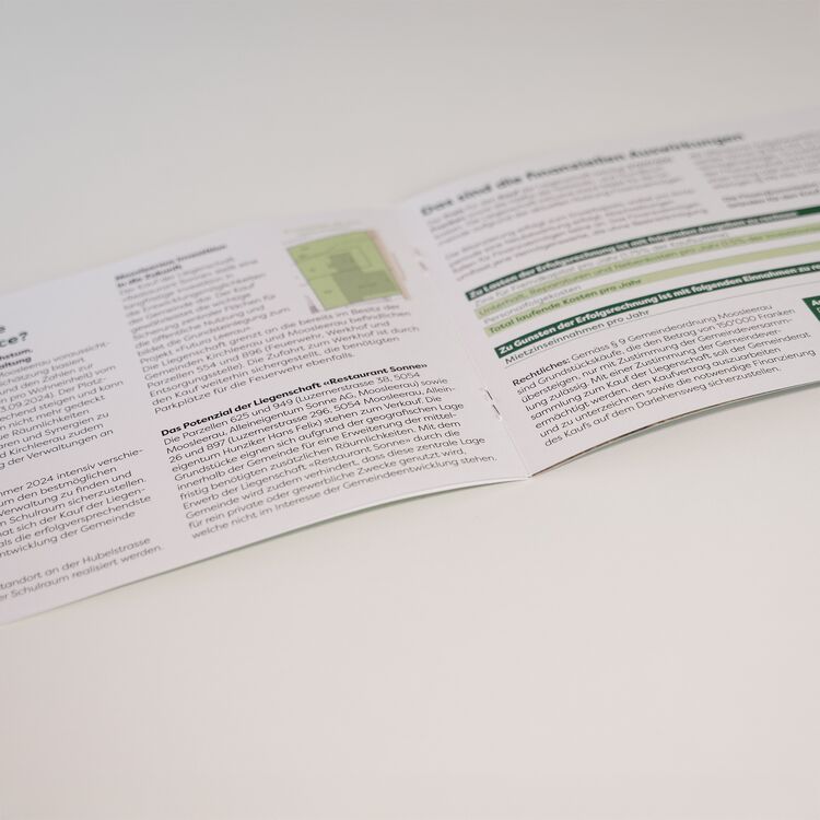Um die Stimmberechtigten transparent und überzeugend zu informieren, wurden wir beauftragt, einen mehrseitigen Flyer mit den wichtigsten Eckpunkten sowie eine begleitende Landingpage mit weiterführenden Argumenten und Hintergründen zu entwickeln. Text, Layout und Publikation erfolgten in enger Zusammenarbeit mit der Gemeindebehörde.