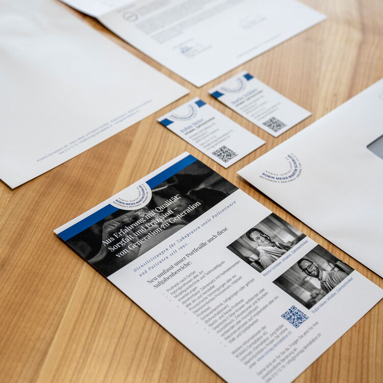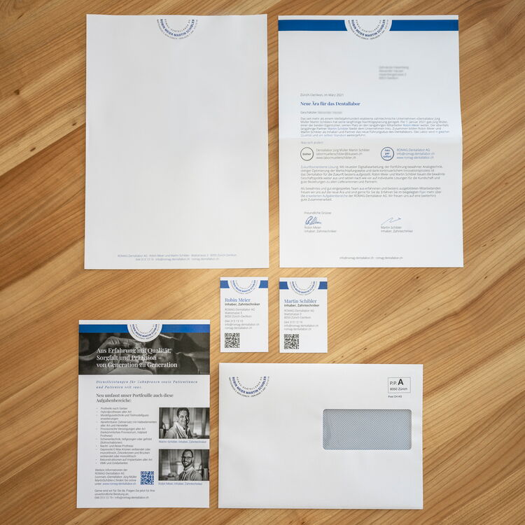 Beim etablierten zahntechnischen Unternehmen ROMAG-Dentallabor AG aus Zürich-Oerlikon stand nach mehr als einem Vierteljahrhundert die Firmenübergabe an. Daraus resultierten eine Anpassung des Firmennamens und eine Schärfung der Dienstleistungen. Um die Kundschaft professionell und attraktiv zu informieren, wurde Stutz Kommunikation mit der Kreation eines Mailings, bestehend aus Begleitschreiben und Flyer, sowie der Gestaltung der neuen Briefschaften (Briefbogen, Couverts, Visitenkarten) beauftragt.