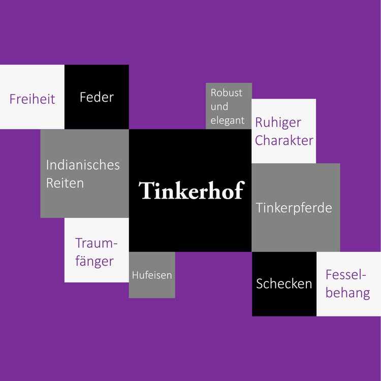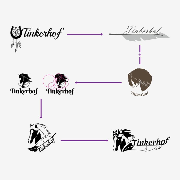 Bald wurde klar: Das Logo sollte die typische Ruhe aber auch die Eleganz von Tinkern ausstrahlen. Es wurden ganze Pferde oder auch nur aussagekräftige Ausschnitte, wie der Fesselbehang, gezeigt. Das indianische Reiten sollte mit Federn, Traumfängern und Hufabdrücken symbolisiert werden.